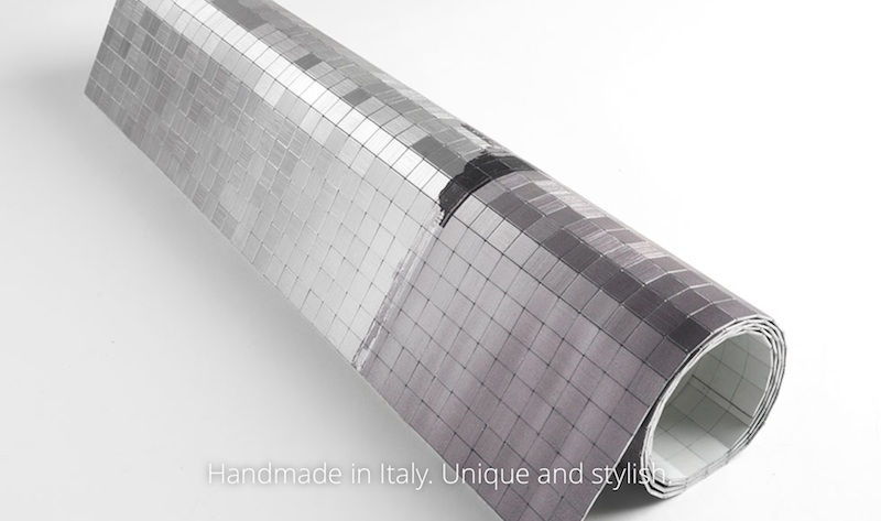 Irial Visual is made of a thin and flexible ‘fabric’ of aluminum tiles that takes on reflections and different shades depending on the viewing angle and exposure to sunlight. The random manual arrangement of the tiles means that each fabric is unique.