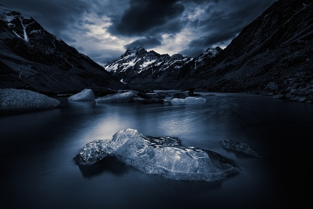 Thanks Yan, I have to confess that at the moment I captured this image, I never envisaged that it would eventually become one of my personal favourites. The title of the photo is called “Desperate Measures” because the behind the scenes situation was really quite frantic. I had carefully set up my composition with this iceberg. As usual I was standing in the ice cold water (this time I stripped down to underwear and sandals since nobody was around) ready to shoot the sunset. Then, at the crucial moment the piece of ice suddenly started to spin and float down the river. I desperately lunged to save it and using my tripod managed to haul it back towards the shore. In fact the sunset was nothing to write home about but the dull conditions forced me to think differently about how I could best make use of the light. The subtle reflection of the cloud on the piece of ice and the surrounding water was the key to making the photo work. In monochrome, I was able to emphasize the glow in a more natural way than it would have been possible in colour. In the end concentrating on creating a dark and ominous mood helped to make this a distinctive Mount Cook shot since almost everyone else focuses on sweet light, colour and reflections. In the past couple of years, I have expanded my repertoire to include more brooding imagery.