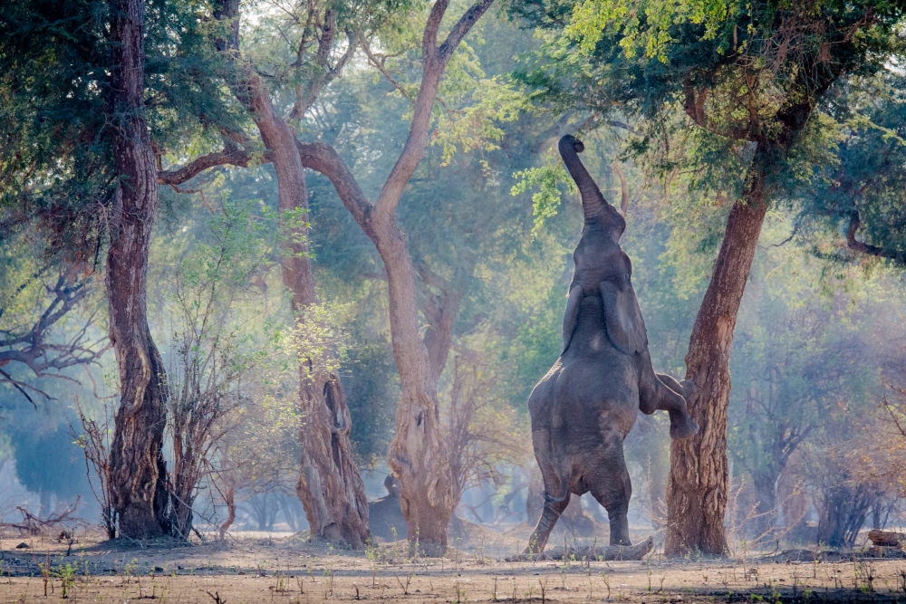 According to Giovanni Casini, who photographed "I wish I was a giraffe" in Mana Pool Park in Zimbabwe, it is rare for elephants to stand up to reach a high hanging tasty snack. He caught quite a unique moment - and photographically did a wonderful job. The atmosphere is beautiful, there are lots of interesting details present in the picture and it tells a funny story.