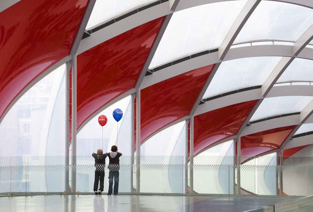 The commercial complex Médiacité in Liege, Belgium is a very modern structure with magnificent graphic design and appeal. The roof especially is quite unique with its network of steel arches and alternating red and transparent glass diamonds in varying sizes. The steel latticework creates many interesting patterns, and the transparent glass allows natural light to illuminate the gallery.
