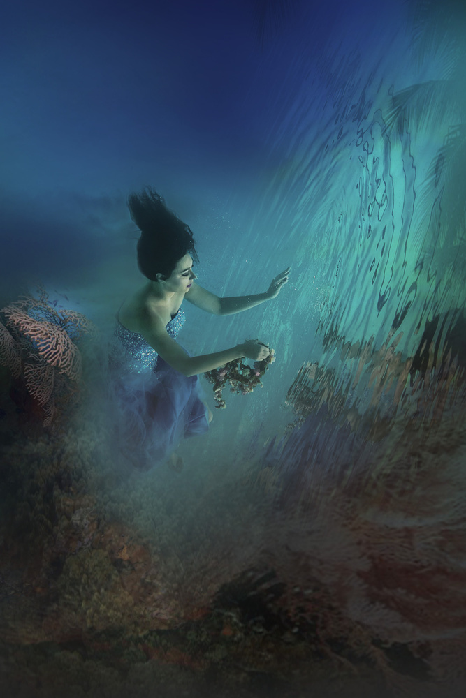 During underwater photography there is no way to verbally communicate with the model due to the location. So before starting the post processing, the photographer will have to go through all the shots. Each shot has its own character and mood due to different poses and mimic. From this the photographer gets an idea about the post processing. It is just like preparing what a painter would like to paint. Therefore the result would be the photographer’s imagination of the model’s feeling. I would start with raw setting and ensure texture is clarified so it will not fade away during blending. I use a lot of blending especially to get certain natural colours. I prefer to take a shot of a colour which I want to blend into my photo to create the exact colour that I like.
