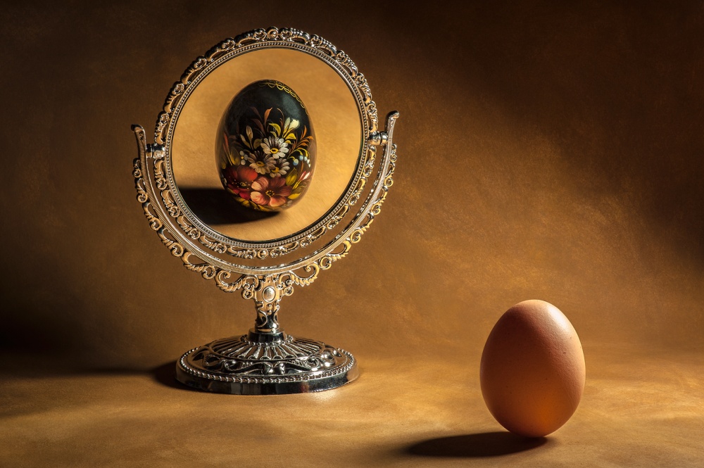 "In front of the light I mounted a snoot made out of aluminum foil to direct the light. This created a kind of vignetting around the image and a stream of light on the background that guides the eye from the egg toward the mirror."