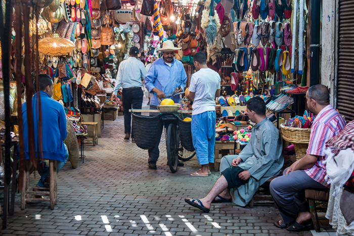 The souks themselves are helpfully divided into product groups such as bags, shoes and other leatherware; copper and ironmongery; clothing and brightly dyed fabrics; fruit, vegetables and other foods and so on. The streets are narrow and often partially covered with slatted roofs which mean that light levels are low and space is at a premium. In these conditions, I wind my ISO setting up to 800 or 1250 and juggle the best compromise between depth of field and shutter speed, often ending up with 1/10s or slower at f5.6 on my 24 – 120mm trusty ‘walkabout’ lens.