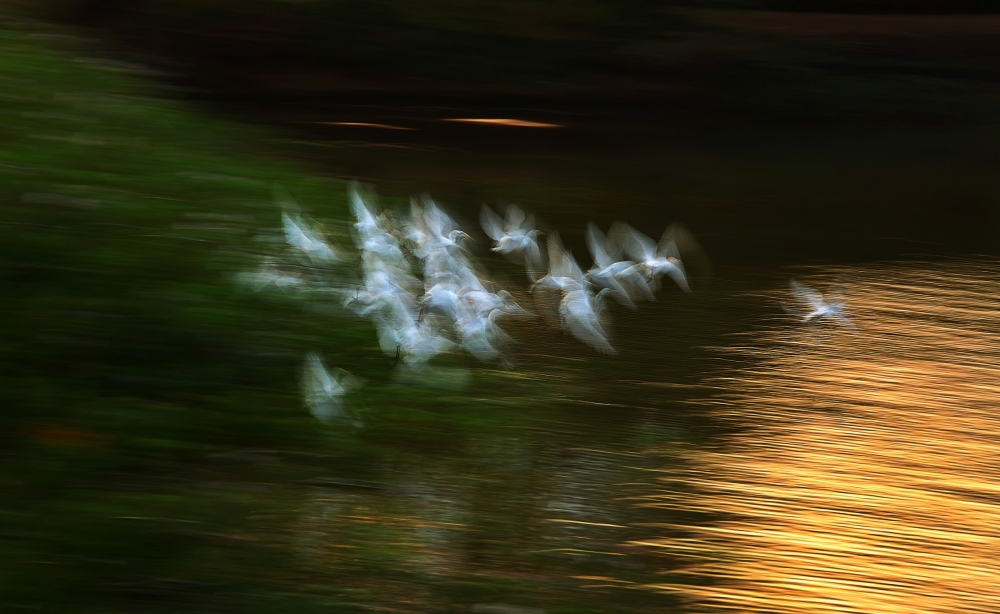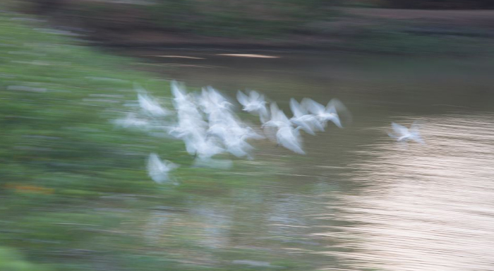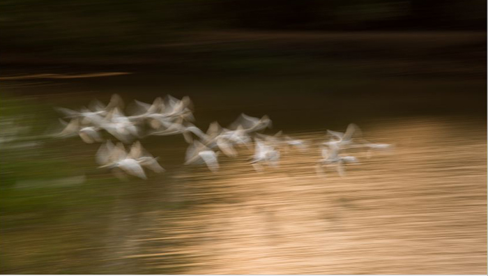 I tried the same picture at 600mm with the following result and it adds to the abstract feeling of the image. But setting a focal length of 200-300mm will include the habitat and will lesser compress the birds.