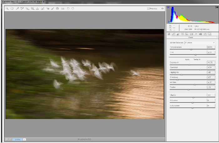 I opened the picture in ACR 7 and made basic adjustments on the white balance (to increase the warmth) and on the exposure. I decreased the exposure to -0.7 and pumped the contrast to +34 to make the whites on the egrets popping out and also to make the background darker.