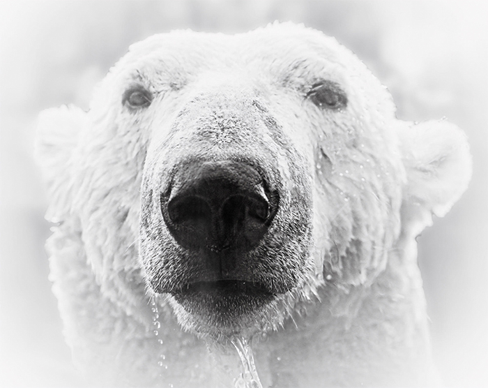 An animal look that could mark me and make me say that I would have liked to see it with a smile is the one I captured on a polar bear. You will tell me that technically, it is not terrible. But I think that the emotion is there. Here is a face-to-face look with a polar bear. I made this image with an 100mm macro f2,8 lens. Where I had a 60mm macro with my squirrel, this time, with a polar bear, I did it with a 100mm macro.