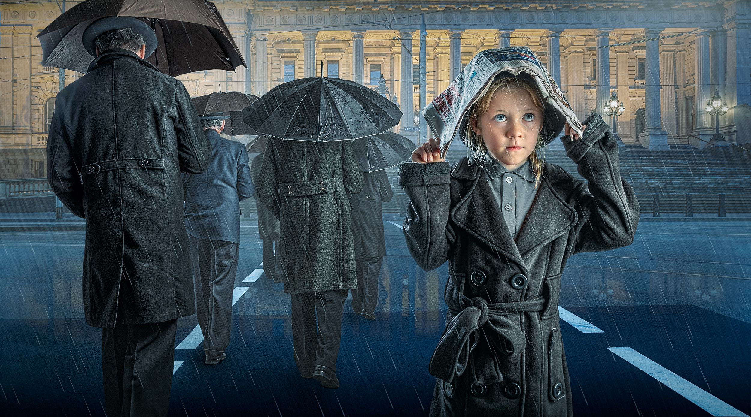‘Against the tide’ started as a background shot of Melbourne’s Parliament House. I deliberately chose a composition that included the pedestrian crossing because of the storytelling potential. I had no clear vision of the final image at this stage, this generally comes later as I ‘play’ with the image in post-production. When I ‘play’ with the story I will revisit past themes and try to present them in a different way. In this work, I have revisited the themes of a rainy night and multiple umbrellas; however, I always try to find a point of difference or an original idea that grabs the viewer’s eye. In this case, it is our little heroine’s newspaper ‘umbrella’.