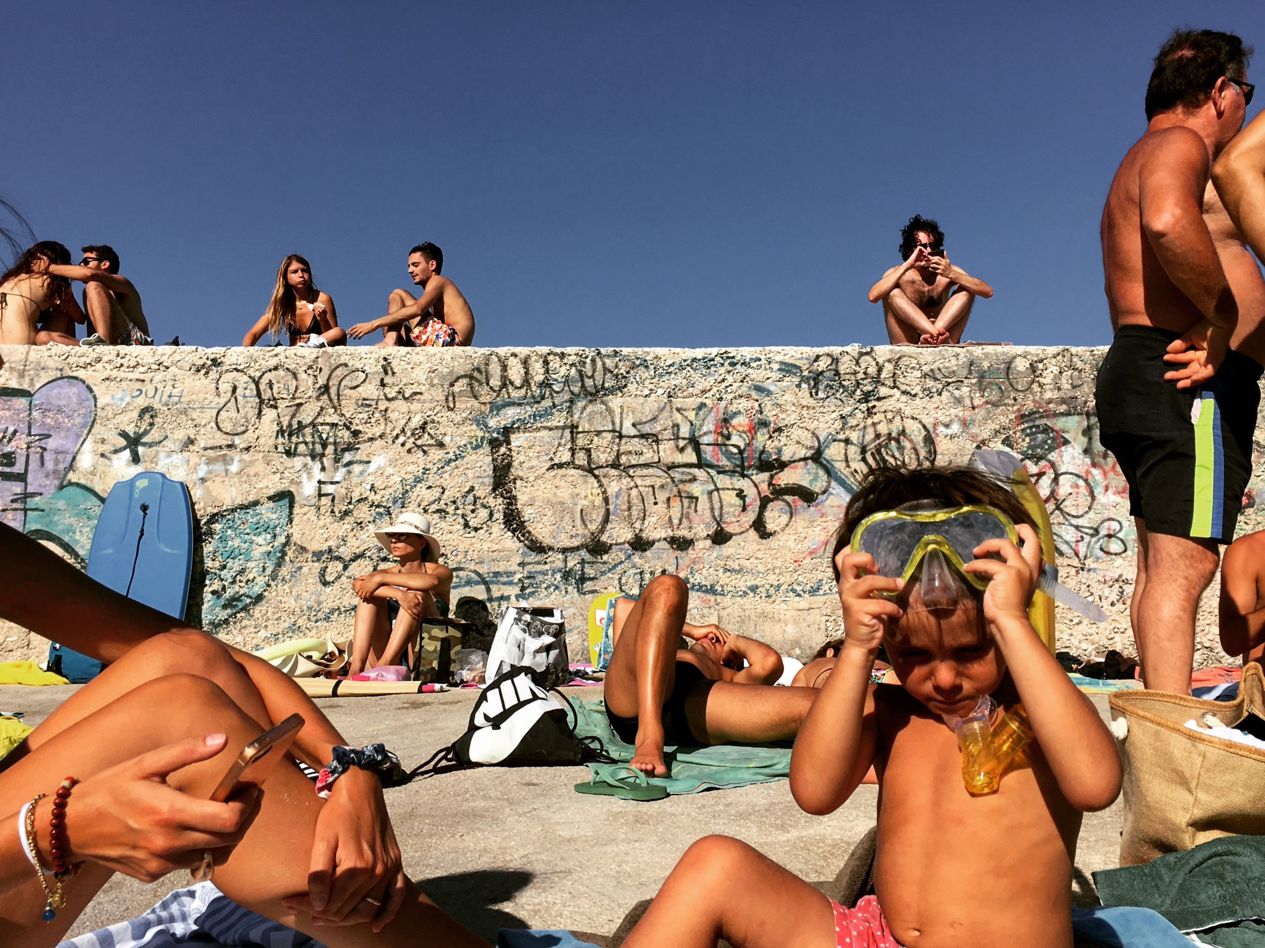 The resulting picture shown today could be viewed and dismissed as a simple snapshot. But if you care to look deeper, it's much more than that. It is of human life in the raw. All apparently on holiday, yet busilly introverted to the scene around them. All that is, apart from the observant photographer who captured the scene. The graffity covered wall that runs through the image stands perhaps as a metaphore for the divide, its graffitied messages studiously ignored. There are so many stories to be read within this disjointed picture of life, that is its own composition.