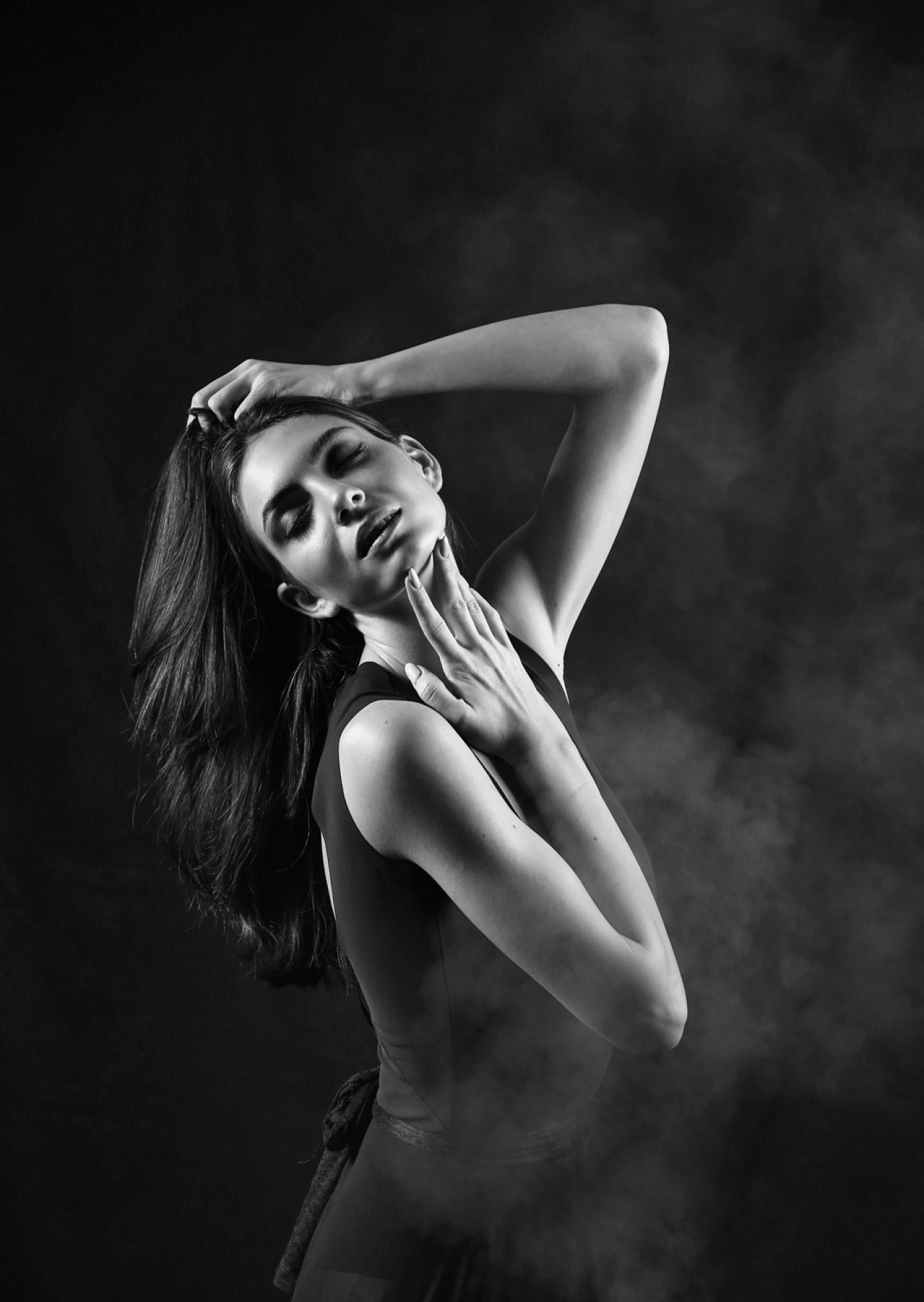 The subject’s arms are also important in maintaining the overall S-curve or hourglass shape. For example, if the arms are facing downwards, it is important that the elbows are slightly bent so that there is a gap between them and the waist, else the shaping effect is lost. Symmetrical shaping of the arms (as in both hands on hips or above the head) is often effective but, taking the concept of contrapposto a little further, posing the arms asymmetrically (one hand on the hip, the other stroking the hair) can give a wonderful sense of visual balance, movement, sensuality or drama, as in Michaelangelo’s David.