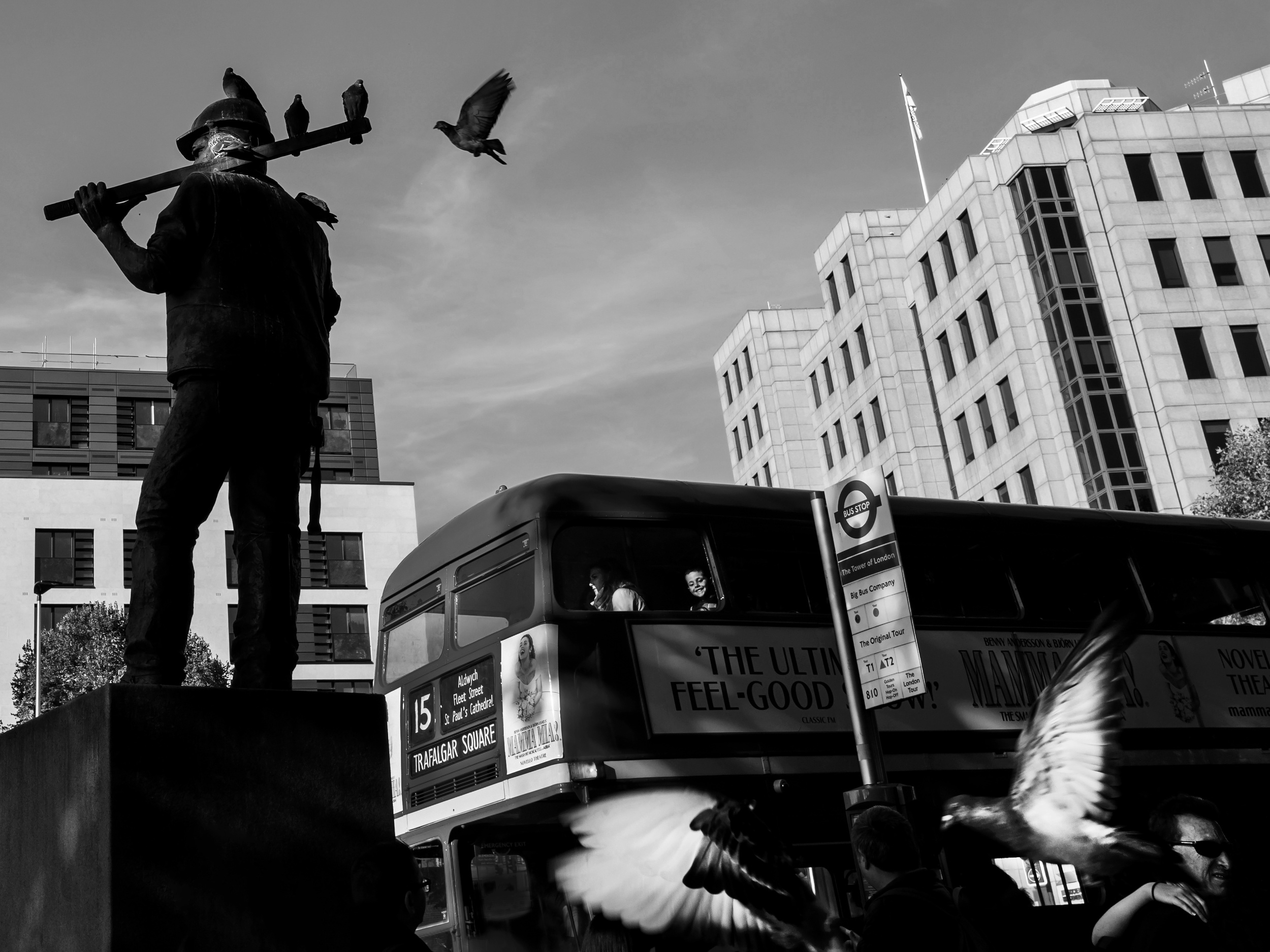 Maybe the “Birds of Peace”. Pigeons are called the birds of peace but on this picture we can see those birds flying around in chaos.  But watching carefully the photo, one can see a boy laughing inside the bus which shows a sense of humour. The black and white tones on the birds are reflecting light and shadows.