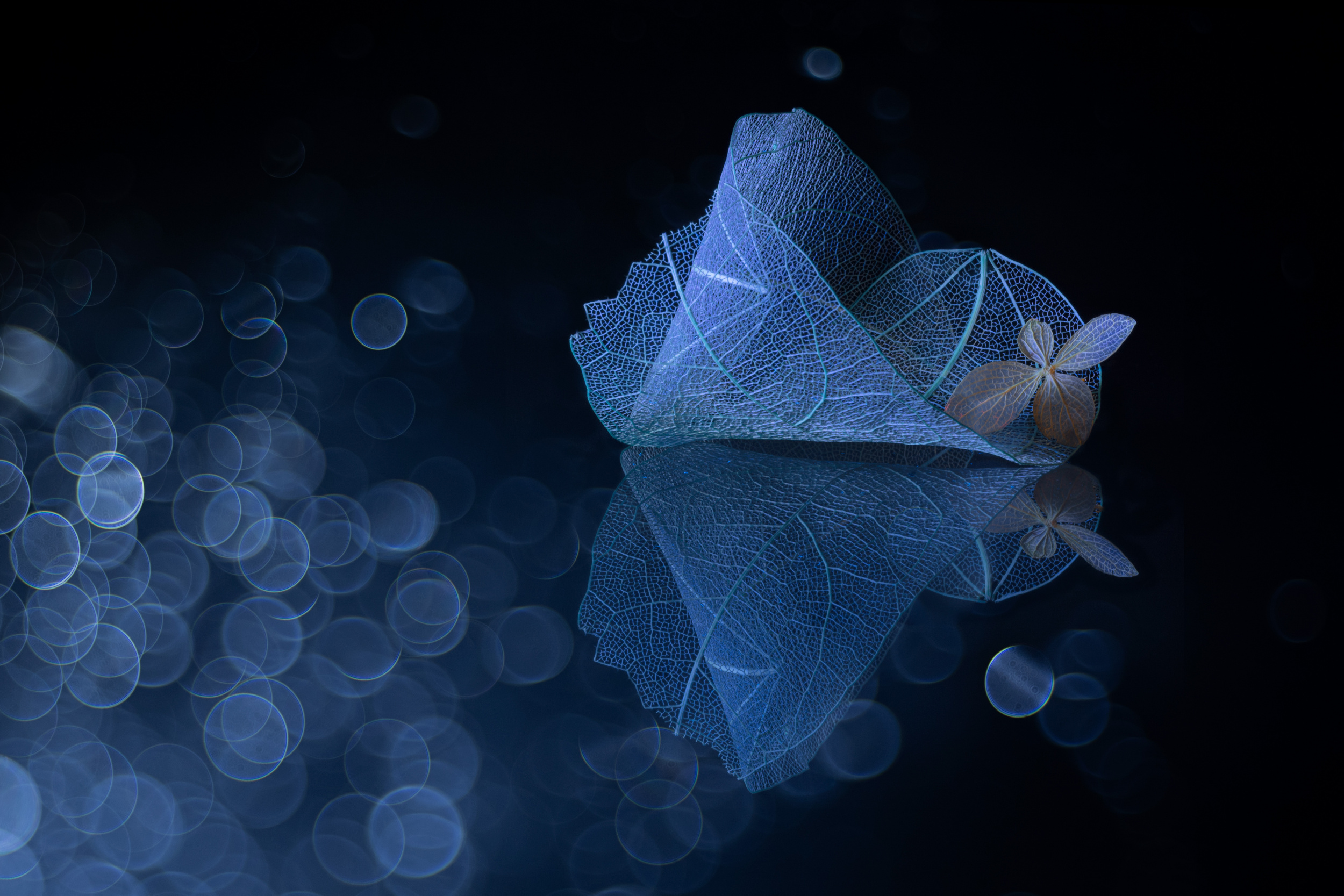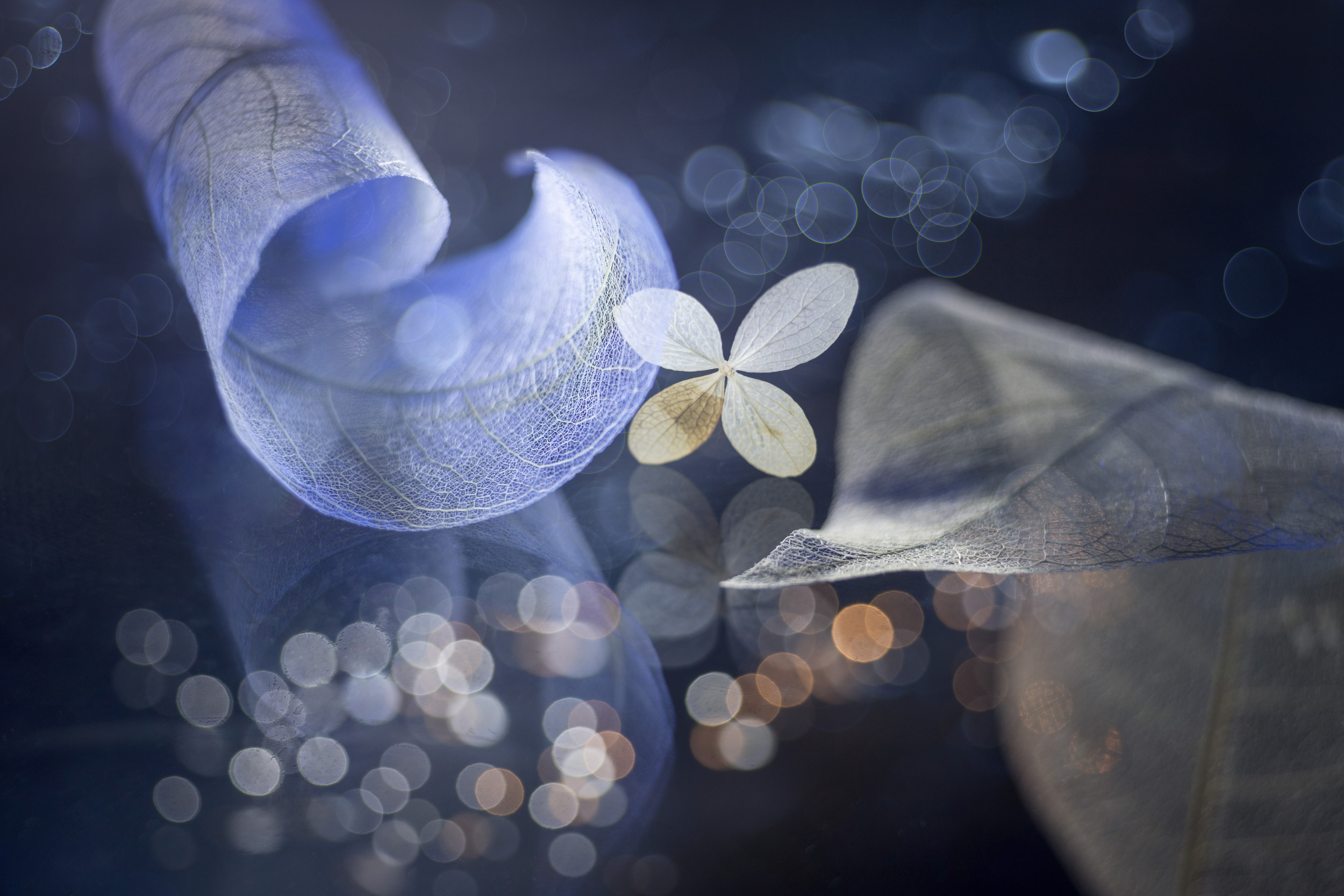 But I can tell something about an unusual photo. The set-up is built on glass and illuminated by a light source and under the glass - as if forming a continuation - another composition is built, which in turn is laid out on the glass where water droplets forming bokeh are located.