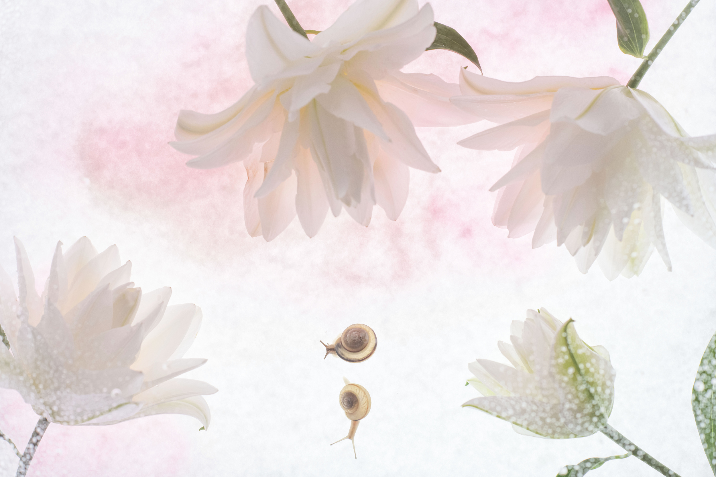 Then, when school was closed, I started creating flower art pieces to show them. I wanted to create something coming from a fairy tale world with flowers and snails that I was raising home.