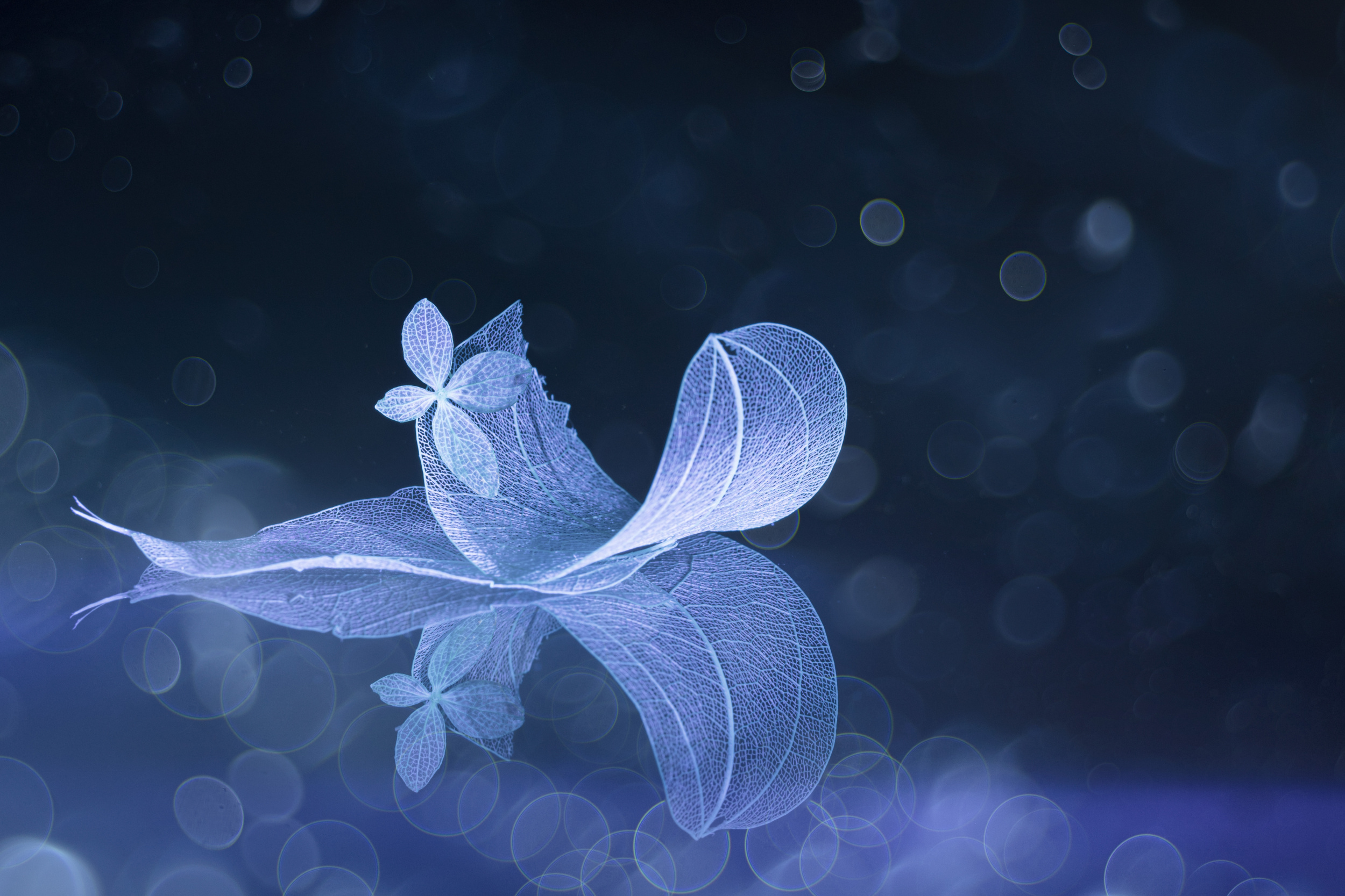 You need glass plates of at least 420 x 210mm so that their edges are not visible in the frame. I used two of them. One is vertical and the other horizontal, on which I placed the subject. I used skeletonised magnolia leaves, which I bought on the internet, and hydrangea flowers.